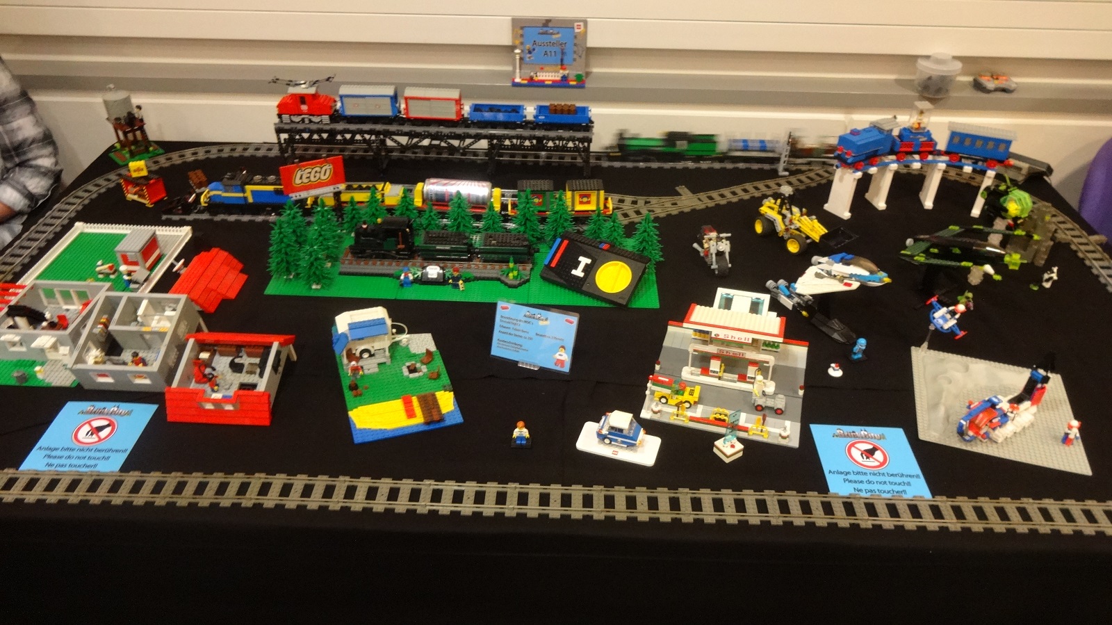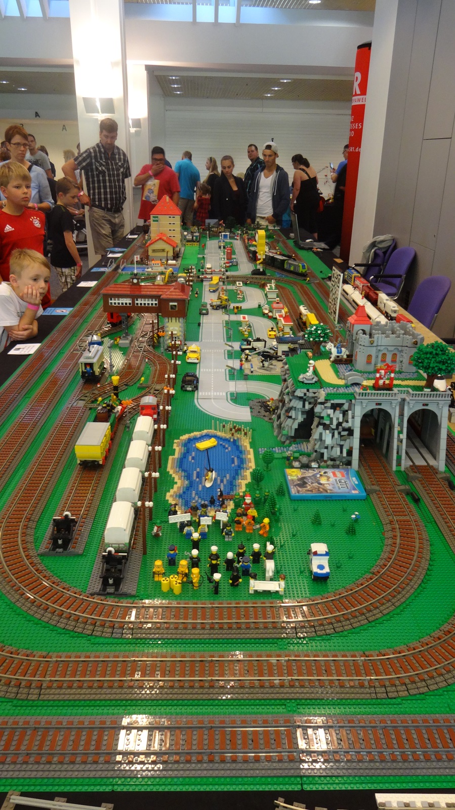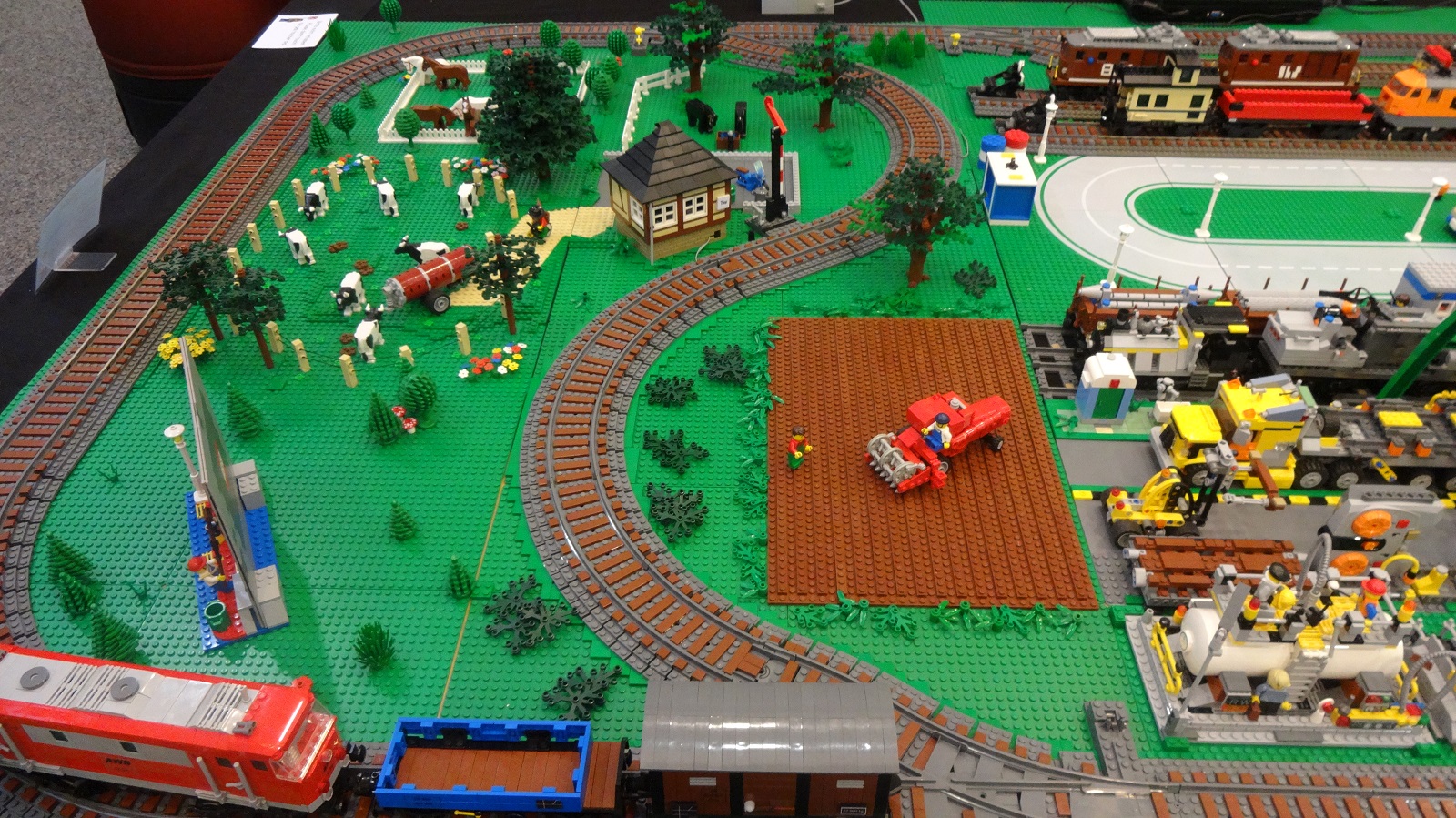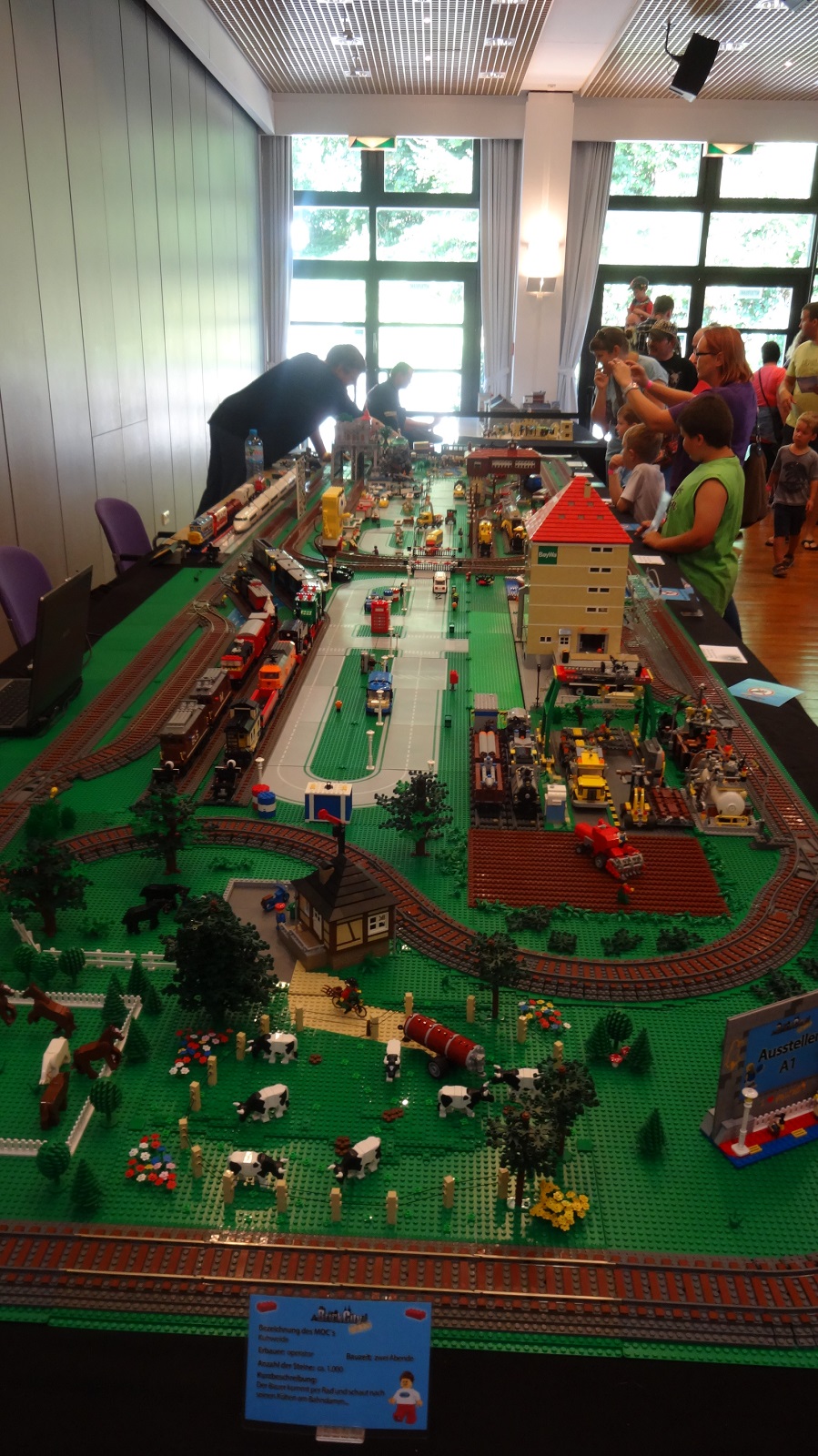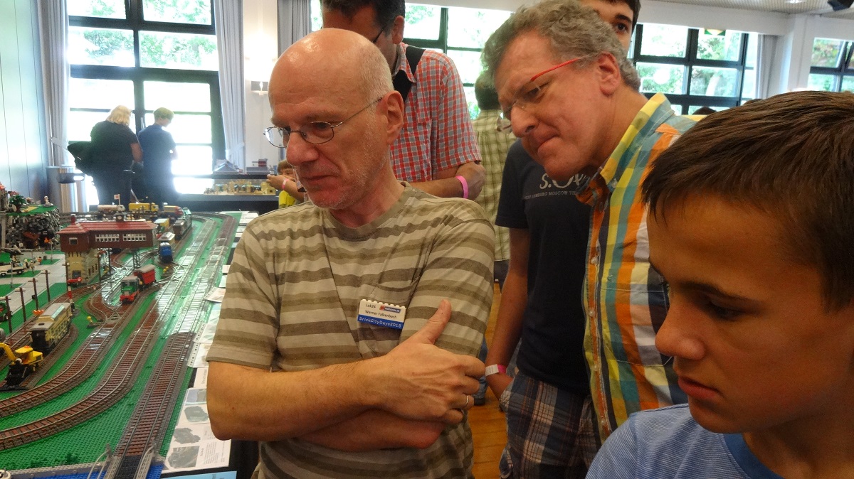 Nun ging es in die andere Ecke. Dort waren die großen Legowelten aufgebaut: Thomas (Kirk) hatte mit Lok24 eine schöne Eisenbahn aufgebaut. Da wir das demnächst auch wollen, mußte ich mir das genauer anschauen.