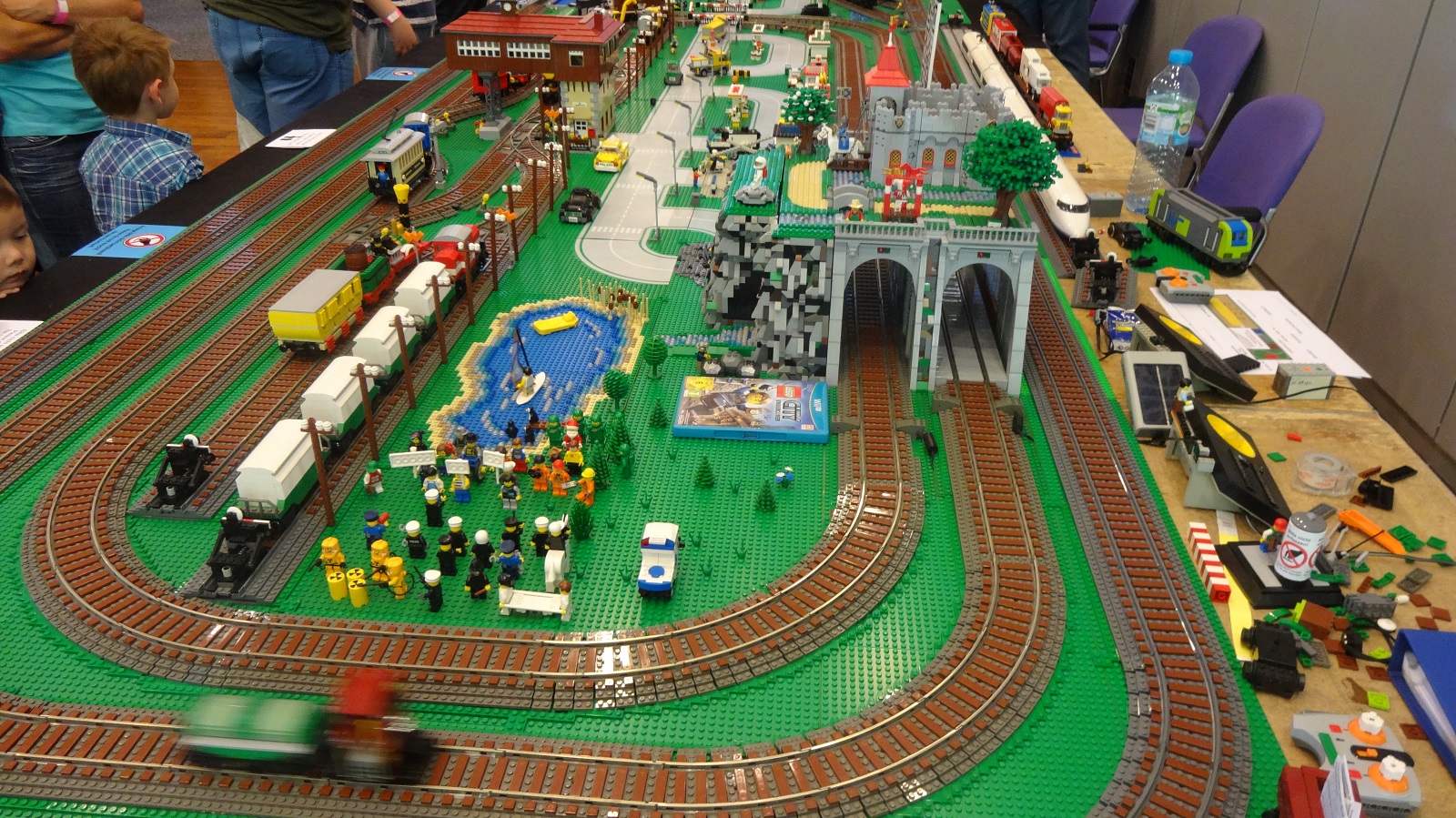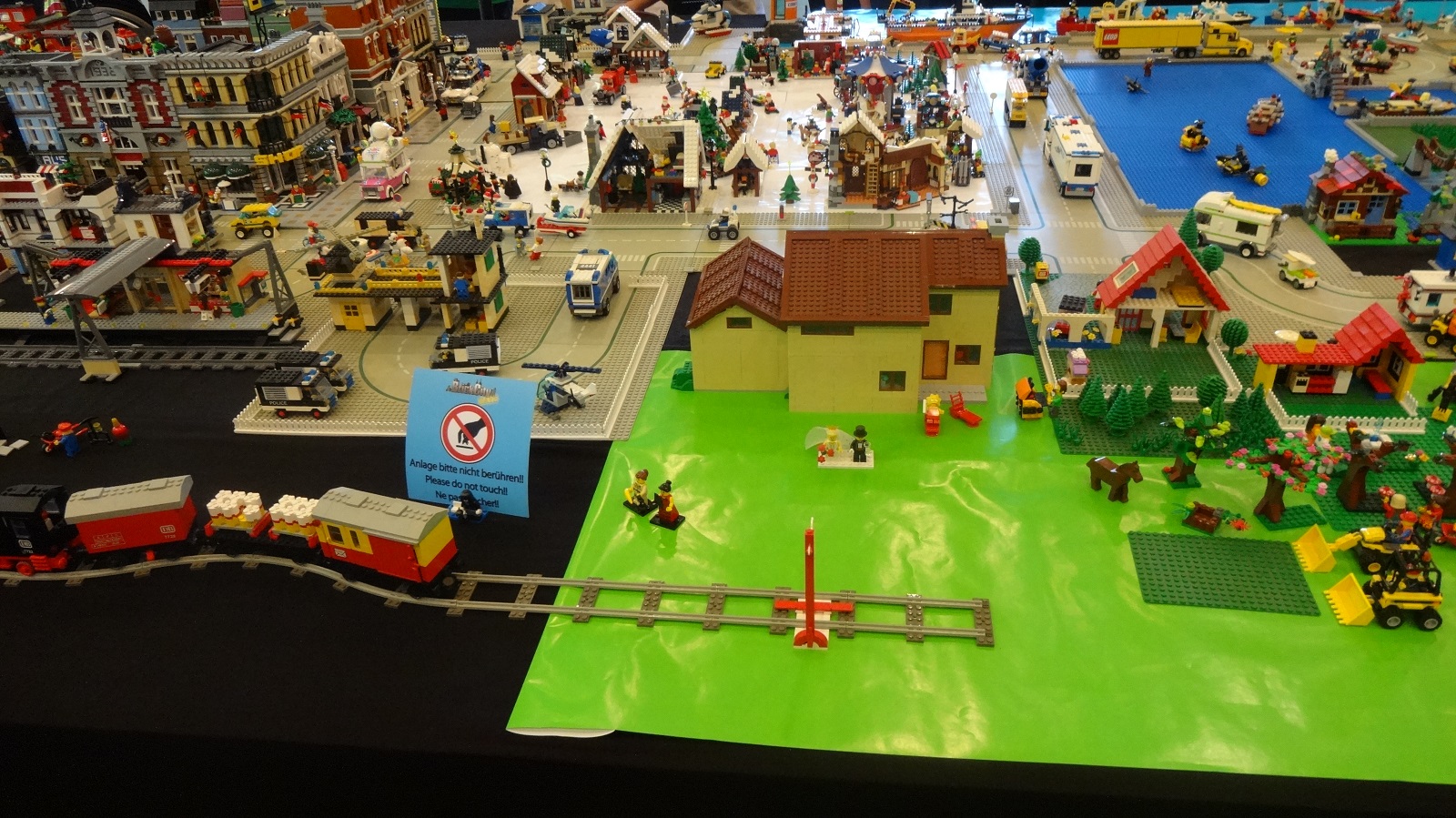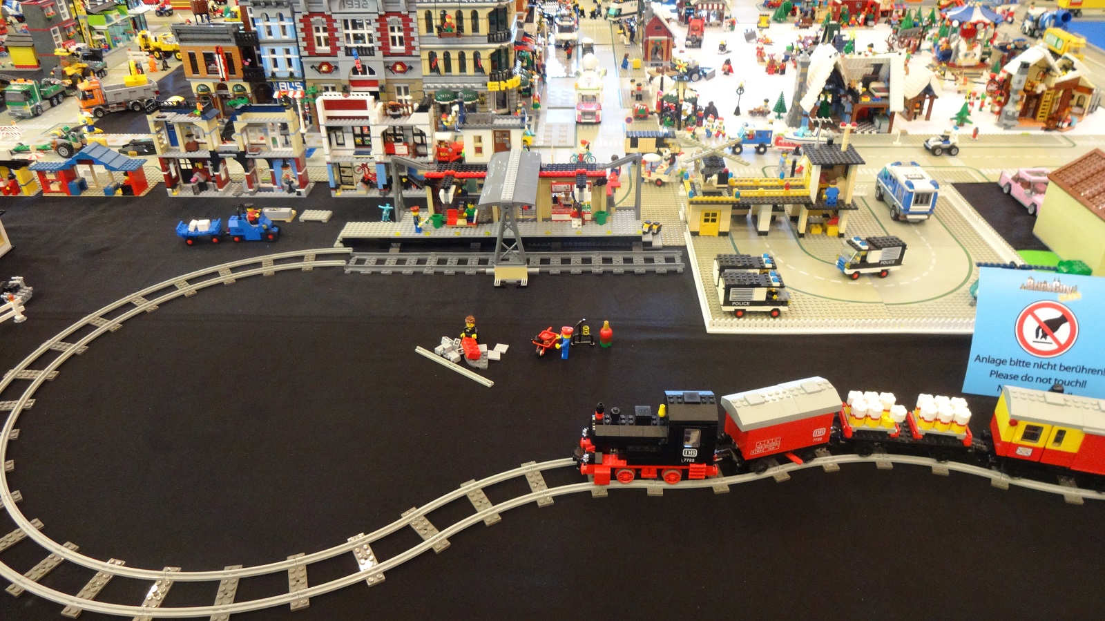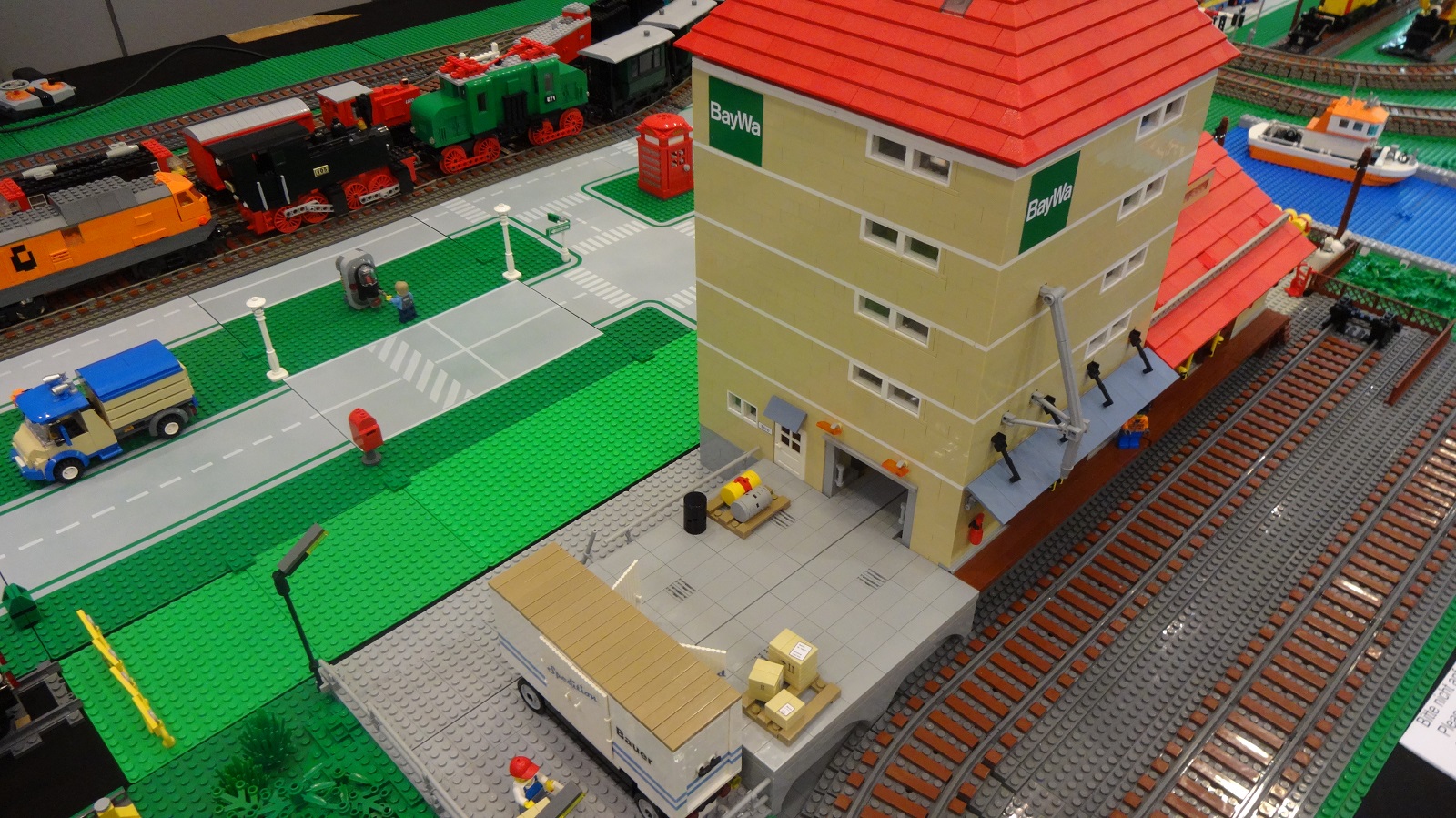 Nun ging es in die andere Ecke. Dort waren die großen Legowelten aufgebaut: Thomas (Kirk) hatte mit Lok24 eine schöne Eisenbahn aufgebaut. Da wir das demnächst auch wollen, mußte ich mir das genauer anschauen.